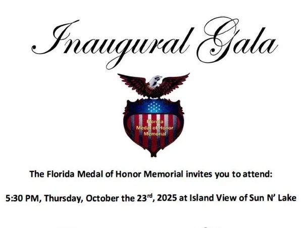 The Florida Medal of Honor Memorial invites you to attend the Inaugural Gala, 5:30 PM, Thursday, October the 23rd, 2025 at Island View of Sun N' Lake.